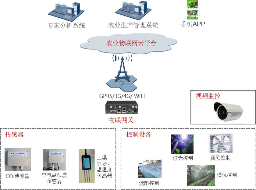 大棚监控室通过“无线视频监控管理云平台”实现远程监控、视频采集、录像回放和智能运维,并为智能硬件数据传输提供服务。